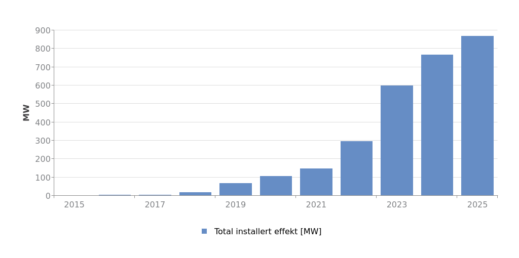 Utvikling i nettilknyttet installert effekt for solkraft i Norge.