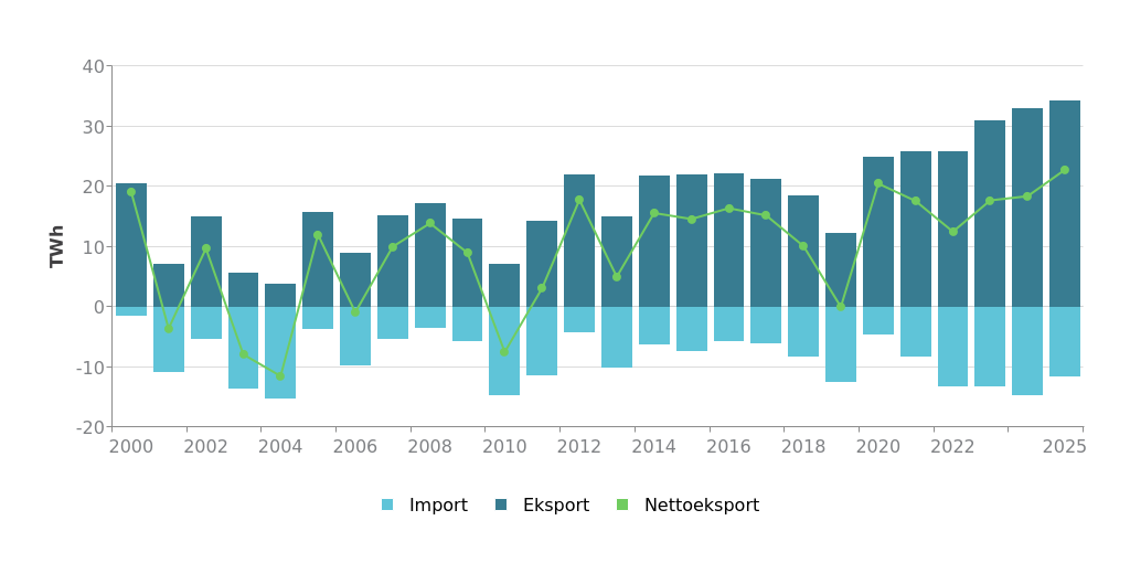 Ved inngangen til 1990-tallet var det et betydelig overskudd i det norske kraftsystemet som ble synligjort ved dereguleringen av markedet. Etter en periode med fallende investeringer i ny kraftproduksjon og en relativt høy vekst i forbruket, ble kraftoverskuddet redusert utover 2000 tallet. Etter finanskrisen i 2008–2009 bidro svakere forbruksutvikling og større utbygging av ny kraftproduksjon gjennom blant annet elsertifikatsystemet til et stort kraftoverskudd. I 2025 hadde Norge et kraftoverskudd på omtrent 23 TWh. Det er et stort kraftoverskudd i historisk sammenheng. I et normalt værår har Norge et kraftoverskudd på 18 TWh. Samtidig er det knyttet usikkerhet til hvordan kraftoverskuddet vil utvikle seg i årene fremover. Dette avhenger av forbruksutviklingen og hva som vil realiseres av ny kraftproduksjon i Norge.
